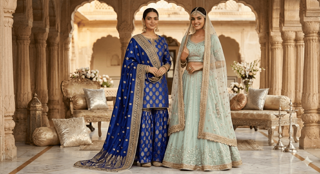 • They elevate heavy lehengas, shararas, and anarkalis by adding texture, movement, and sparkle.
