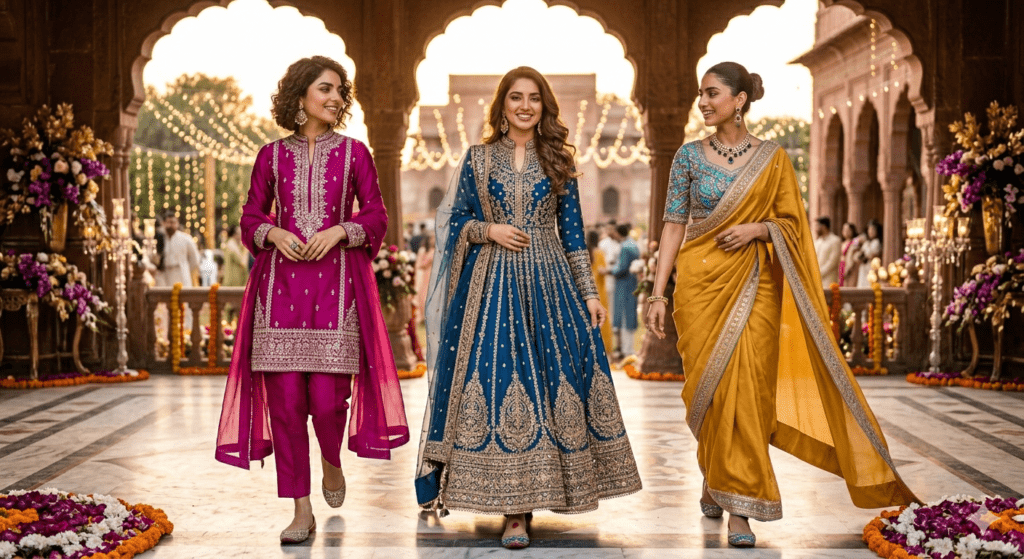Styling festive wear for day and night transitions creates versatile looks that maximize your Pakistani wardrobe for Eid, weddings, and family events. From breathable lawn suits for daytime mehndi in Punjab’s Chuhar Kana to dramatic chiffon Anarkalis for evening receptions, smart swaps in accessories, makeup, and draping elevate one outfit across occasions.